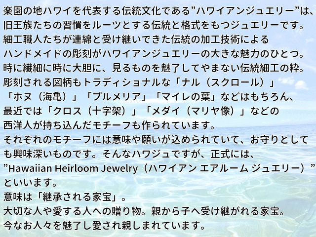 正式な呼び名を、”Hawaiian Heirloom Jewelry(ハワイアン エアルーム ジュエリー)”といいます。