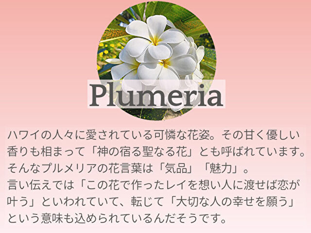 プルメリアはハワイ人に古くから愛されている花で、その咲き誇る姿は白く可憐なたたずまい。